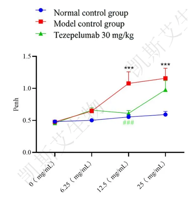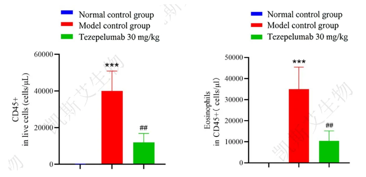 At the end of the experiment, bronchoalveolar lavage fluid (BALF) was collected to detect inflammatory cells. The results showed that the CD45+ cells and eosinophils in the model group were significantly higher than those in the normal control group. After treatment with Tezepelumab, these cells were significantly reduced compared to the model control group.