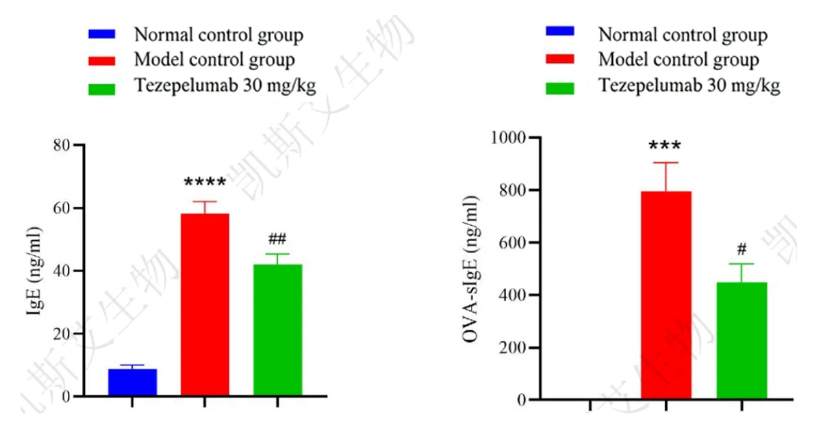 The total IgE and OVA-specific IgE levels in the serum were detected by ELISA. The results showed that compared with the normal control group, the total IgE and OVA-specific IgE levels in the serum of mice induced by OVA significantly increased. After treatment with Tezepelumab, the total IgE and OVA-specific IgE levels in the mice decreased significantly.