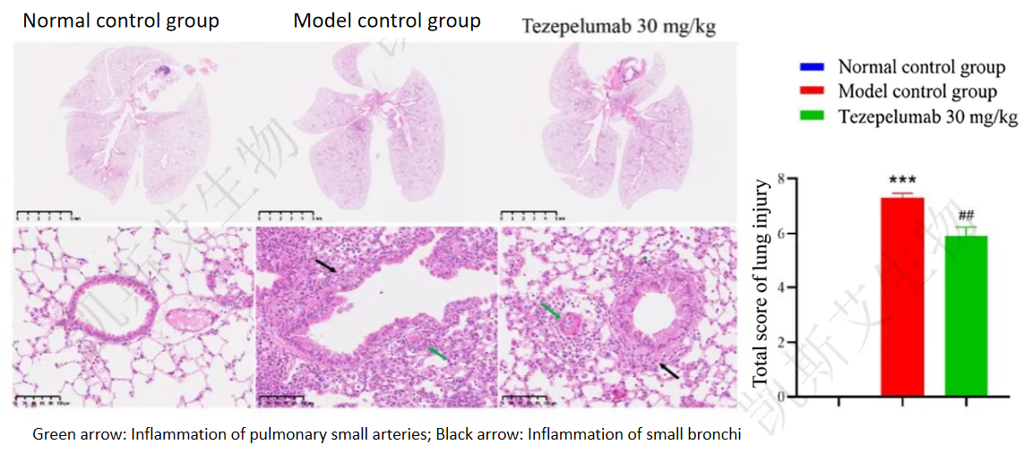 The OVA-induced B-hTSLP/hTSLPR plus asthma animal model mainly presents inflammation in the bronchi and pulmonary small arteries of the lungs. After treatment with Tezepelumab, the inflammation significantly improved.