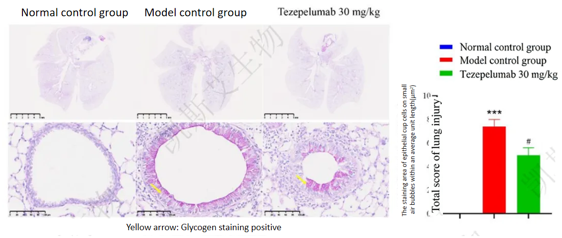 The OVA-induced B-hTSLP/hTSLPR plus asthma animal model showed that the goblet cells in the bronchial mucosa layer proliferated and mucus deposition occurred. The PAS staining results showed that the positive area per unit length was significantly increased in the model group, and it significantly decreased after treatment with Tezepelumab.