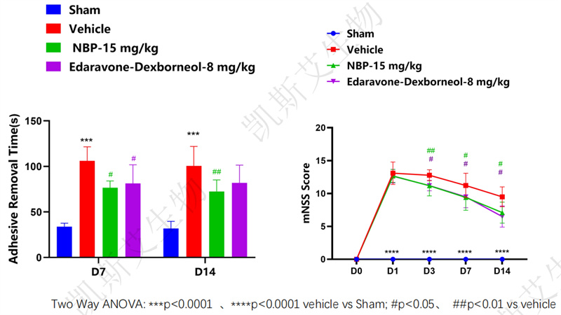 阳性药物依达拉奉右莰醇和丁苯酞给药7天和14天均能够减少大鼠脑缺血模型神经功能损伤,减少贴纸移除时间。