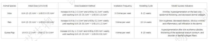 • If focusing on epidermal damage: use UVB irradiation alone; If focusing on dermal aging (such as wrinkles, collagen loss), use UVA irradiation alone.