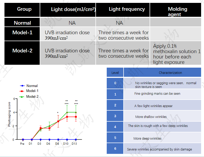 The success of the photoaging model needs to be comprehensively judged through "appearance observation+histopathological examination" - appearance reflects the overall phenotype, while pathological sections reveal the microscopic changes in each layer of the skin, which is the gold standard for model validation.