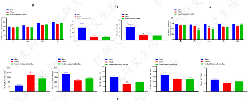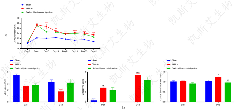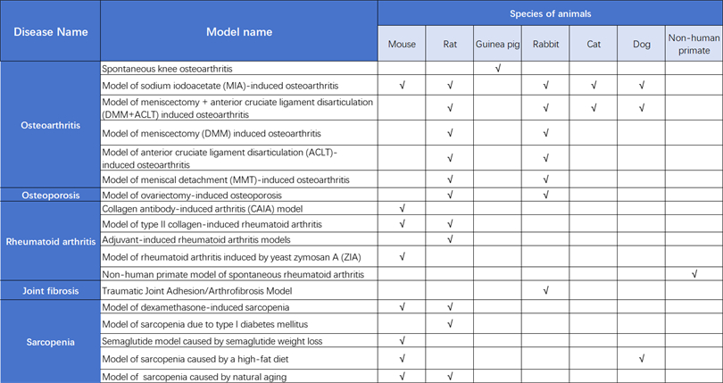 ▪ Model effectiveness: The rat osteoarthritis model was induced by anterior cruciate ligament transection (ACLT) and meniscus transection (MMT), the New Zealand white rabbit osteoarthritis model was induced by anterior cruciate ligament transection combined with meniscus resection, and the guinea pig spontaneous osteoarthritis mild to moderate model all showed significant histopathological damage, providing reliable model data for the study of osteoarthritis.