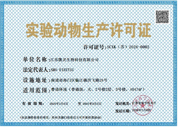 Recently, KAL Biotech Inc. (hereinafter referred to as "KALBiotech"), a wholly-owned subsidiary of KCI Biotech Inc, successfully obtained the "Experimental Animal Production License" officially issued by the Jiangsu Provincial Department of Science and Technology. This marks that the KAL Biotech Experimental Animal Breeding Center has obtained official recognition and will be officially put into use. This is an important strategic upgrade for KCI Biotech, which will further meet the technical service needs of global pharmaceutical companies and research institutions in the field of biological experimentation and evaluation research.