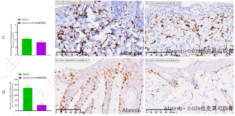 • a-组织病理检测表皮和真皮厚度、b-组织病理检测表皮和真皮内炎症、c-IHC-CD68、d-IHC-ki67