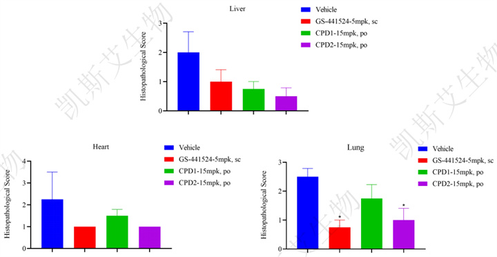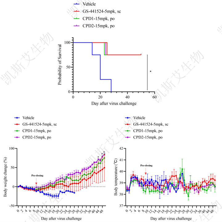 与模型组相比, 给药后, 各给药组动物体重开始恢复增长,体温在不同时间段具有降低趋势; 与阳性药GS-441524组相比, CPD1组和CPD2组体重恢复增长趋势更加明显, 其中CPD2组具有统计学差异。同时,GS-441524、CPD1、CPD2给药治疗均能显著改善动物的生存周期。