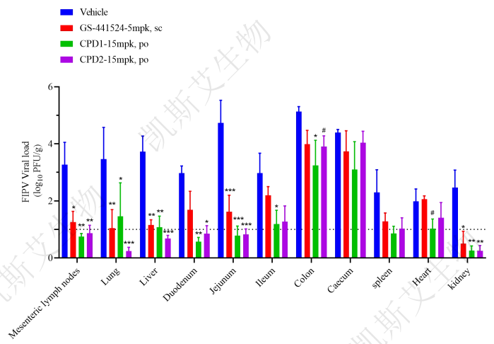 与模型组相比,GS-441524组、CPD1组、CPD2组主要脏器FIPV病毒载量显著下降,整体处于极低或低于检测下限。
