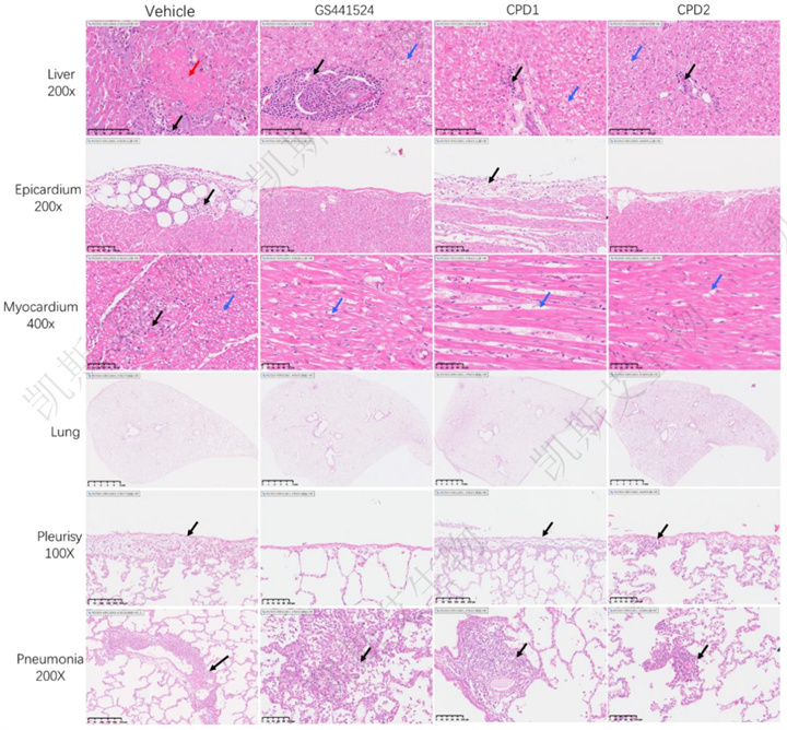 模型组动物呈现全身性脏器病变,心脏表现为心肌炎、心肌变性和心外膜炎,肝脏表现为肝细胞变性、坏死和炎症,肺脏主要表现为胸膜炎和少量的肺泡炎症,肾脏表现为肾小管变性和肾间质炎症,脾脏表现为脾脏淤血和炎症,肠道表现为黏膜糜烂和炎症性肉芽肿,肠系膜淋巴结表现为坏死和炎症。与模型组相比,各给药组动物心脏、肝脏、脾脏、肺脏、肾脏、小肠以及肠系膜淋巴结上述病理变化均有明显地改善,病变程度处于轻微状态;不过大肠病理变化没有明显改善,与大肠FIPV载量数据一致。