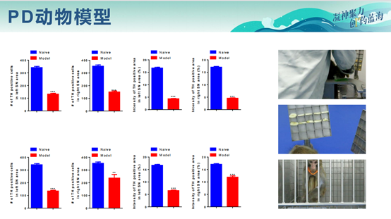同时,我们也用MPTP建立了小鼠和非人灵长类的PD模型,在NHP模型中,在MPTP输注后,我们进行了Kurlan’s评分、采食运动行为评分、大体病理、组织病理、免疫组化染色等多种评价,均有显著性的评价窗口。